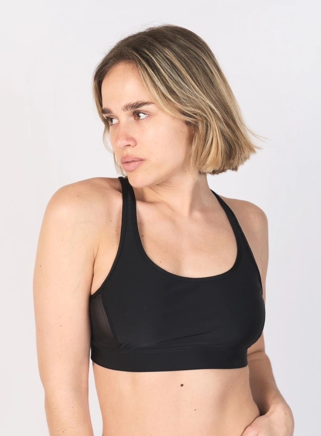 Confeccionada en LYCRA® Tricot de Seda. Material con mayor elasticidad gracias a su doble rebote. Diseño con recortes a los laterales en Powernet y tiras cruzadas en la espalda